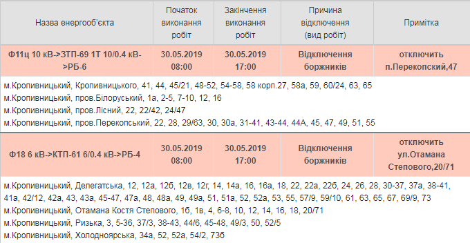 Сьогоднi, 30 травня, чимало вулиць Кропивницького вiдключать вiд електропостачання.