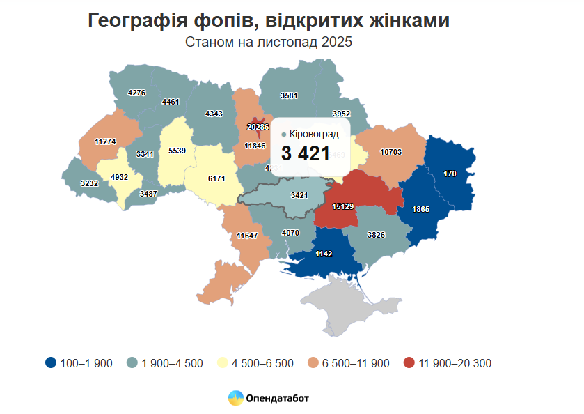 Найбiльше нових пiдприємниць – на Сумщинi, Полтавщинi та Одещинi (по 63%). Але за масштабами, як завжди, лiдер – Київ: 20 286 нових фопiв.