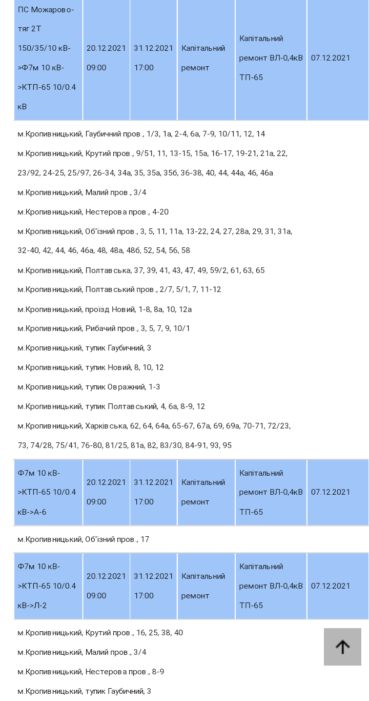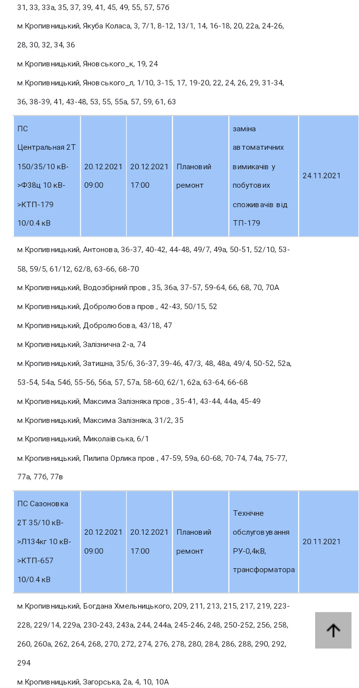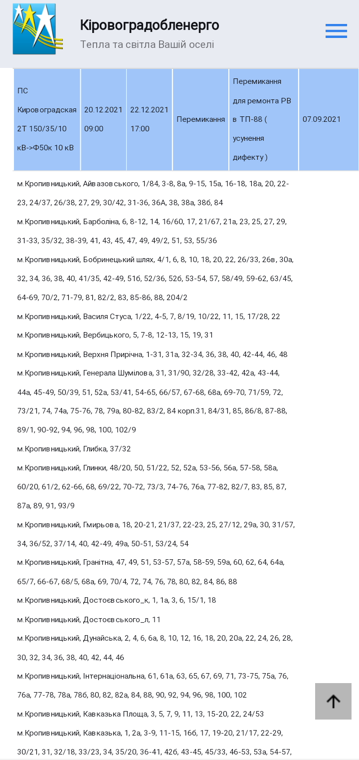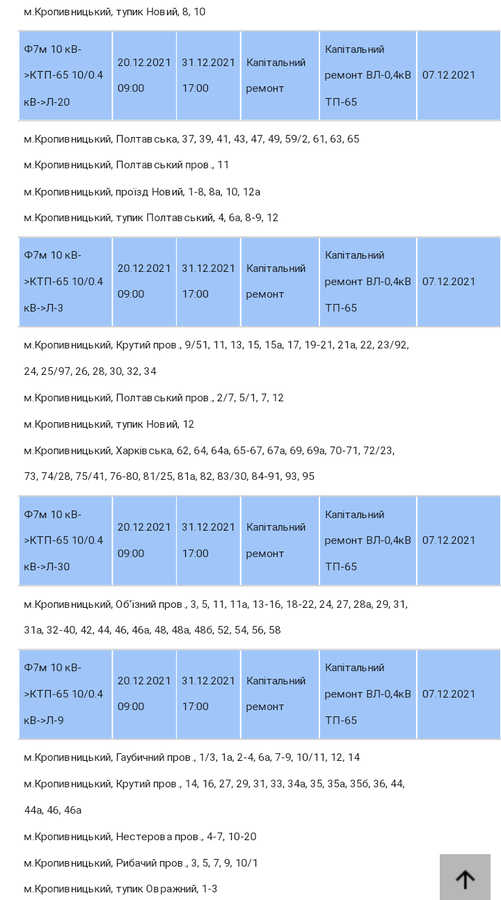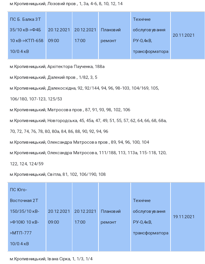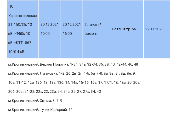 Сьогодні, 20 грудня, низка вулиць у Кропивницькому залишаться без світла через плановий ремонт.