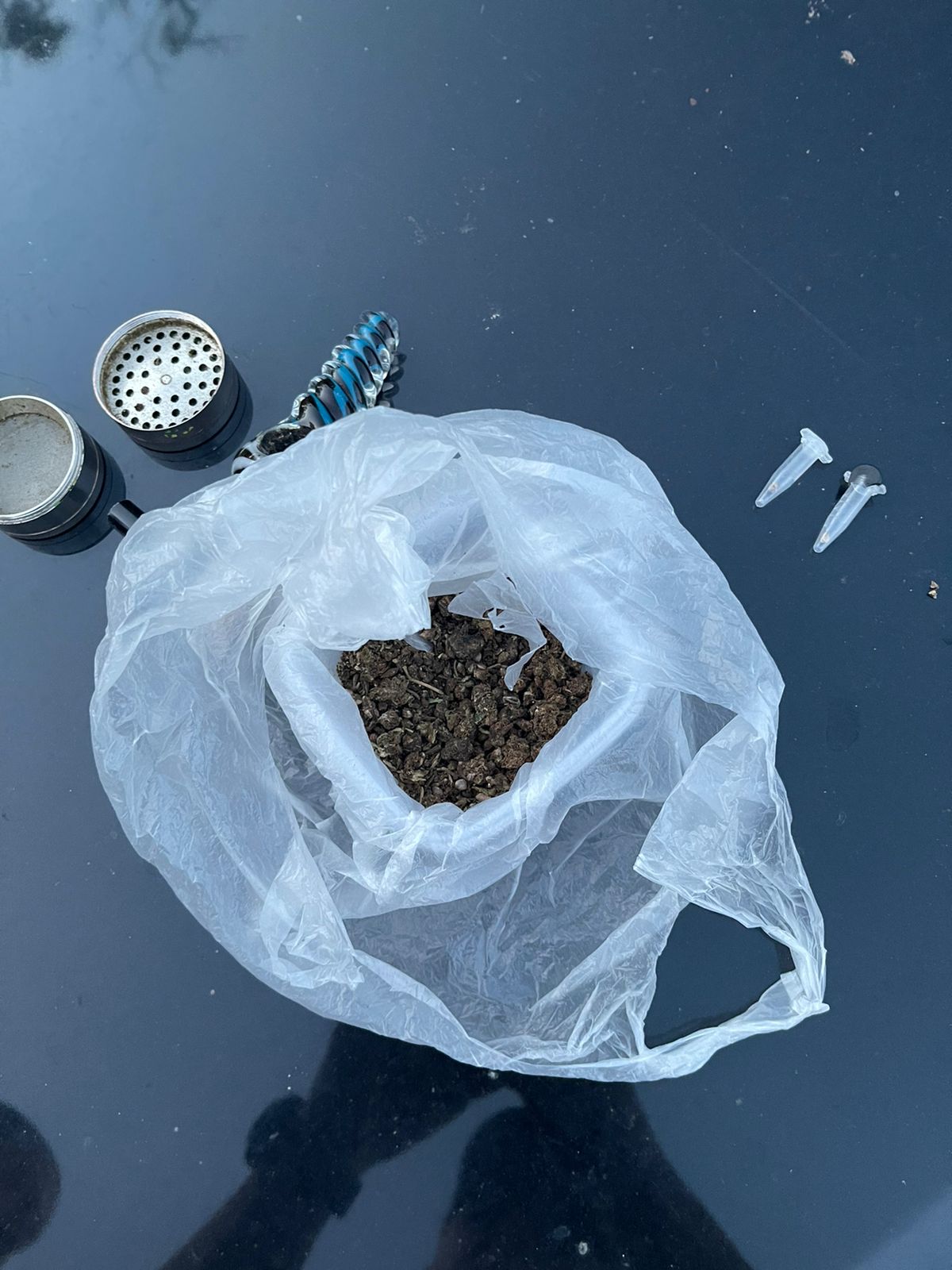 Загалом у трьох чоловiкiв i однiєї жiнки вилучено один полiєтиленовий пакет з речовиною рослинного походження, схожою на каннабiс, з приблизною вагою 5-6 грамiв та чотири полiєтиленових пакети с синьою кристалiчною речовиною наркотичного походження, iз загальною вагою 12 грамiв.