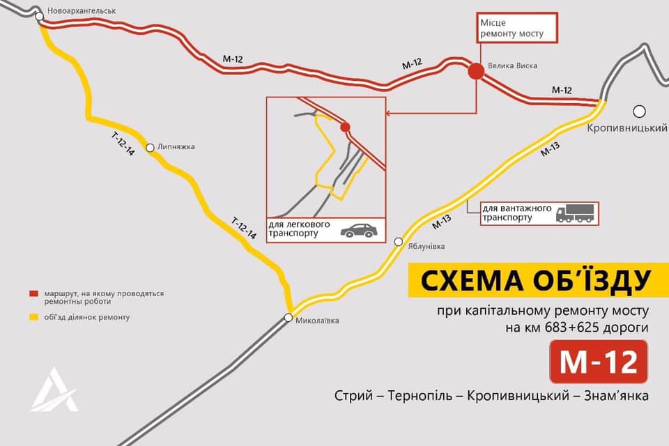 Рух транспорту по дорозi М-12 Стрий – Тернопiль – Кропивницький – Знам’янка через Велику Виску закрито.