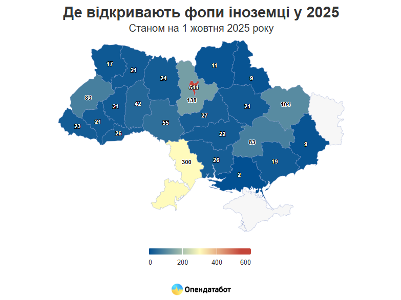 Найгарячіші точки для бізнесу: Київ (544 фопи), Одещина (300) та Київщина (138).