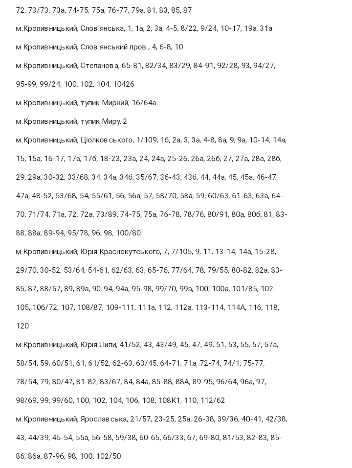 Відключення заплановані з 9 години ранку до 17 години вечора за наступними адресами: