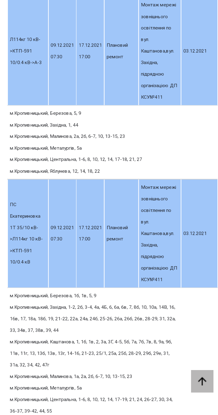 Сьогодні, 9 грудня, чимало вулиць Кропивницького залишаться без світла через плановий ремонт.