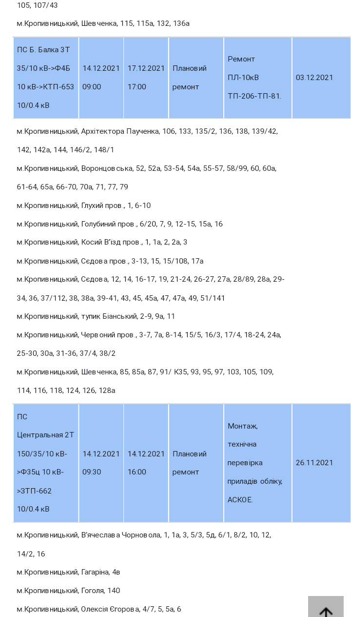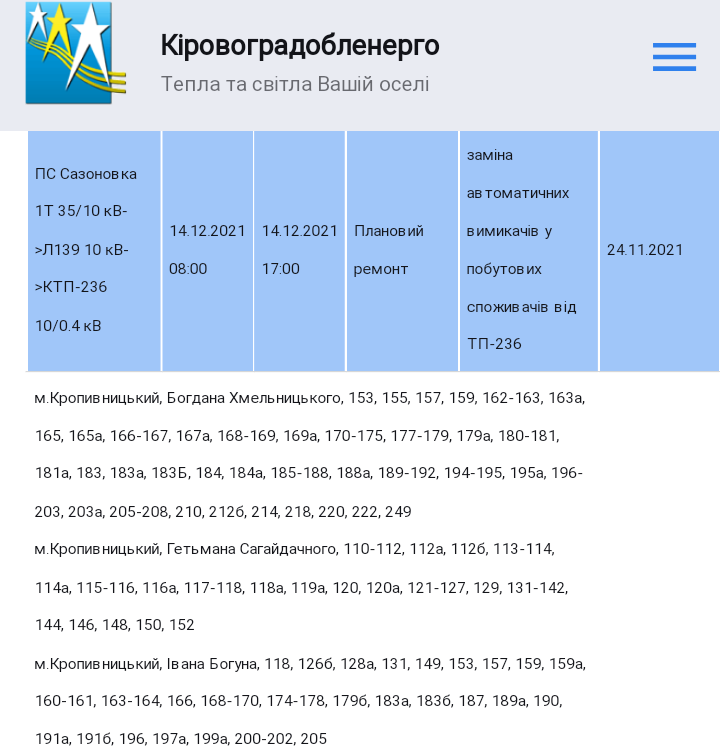 Сьогодні, 14 грудня, низка вулиць Кропивницького залишаться без світла через плановий ремонт.