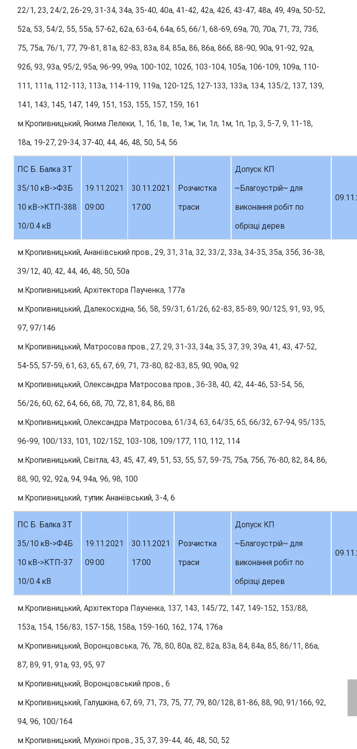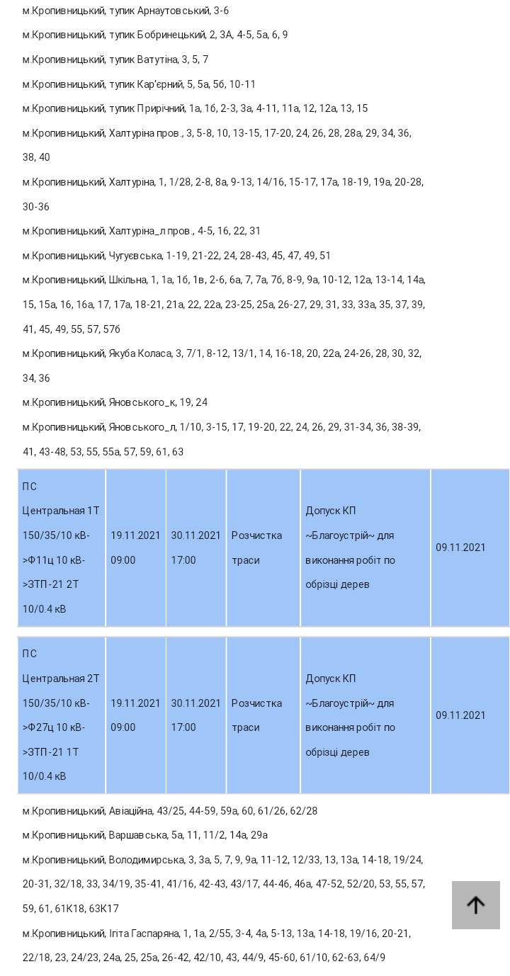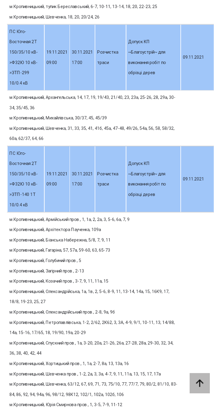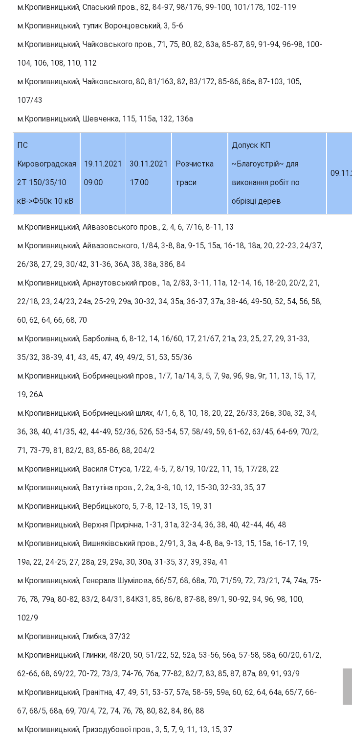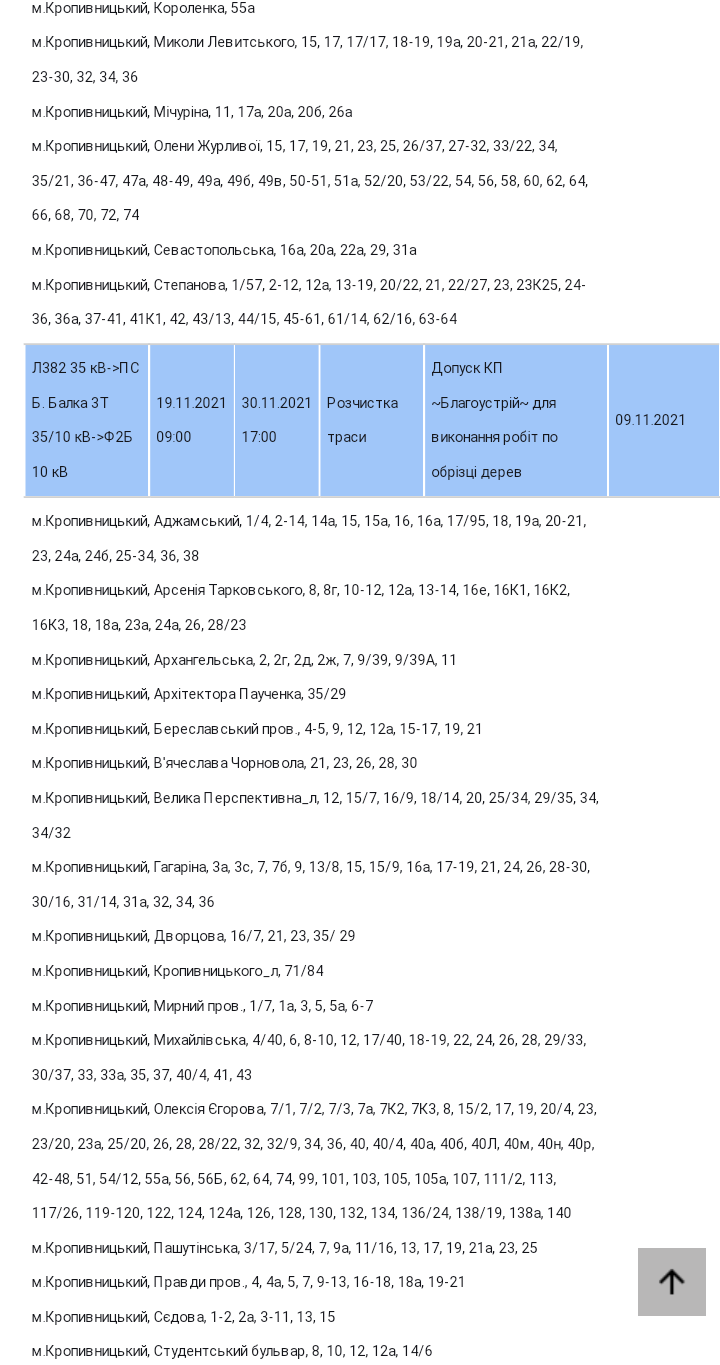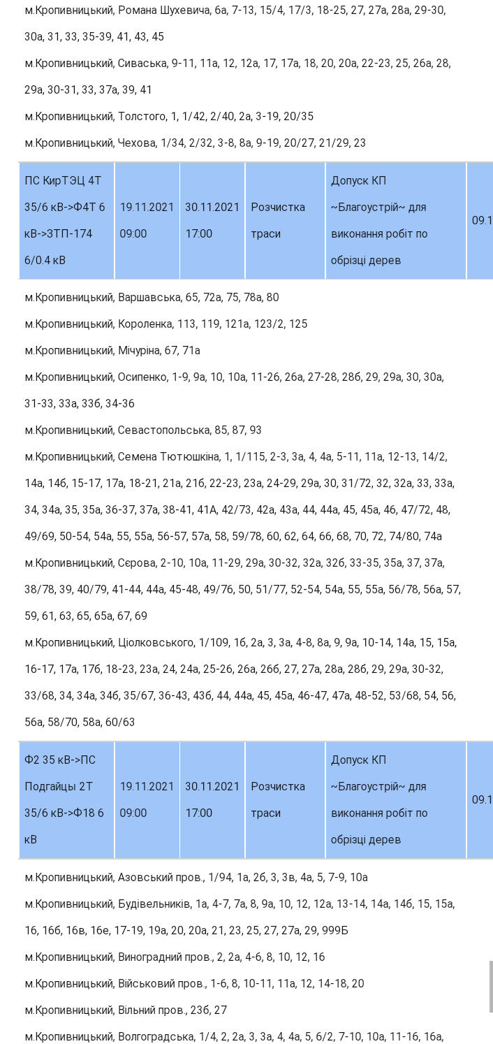 Сьогодні, 19 листопада, низка вулиць у Кропивницькому, може залишитися без світла через плановий ремонт.