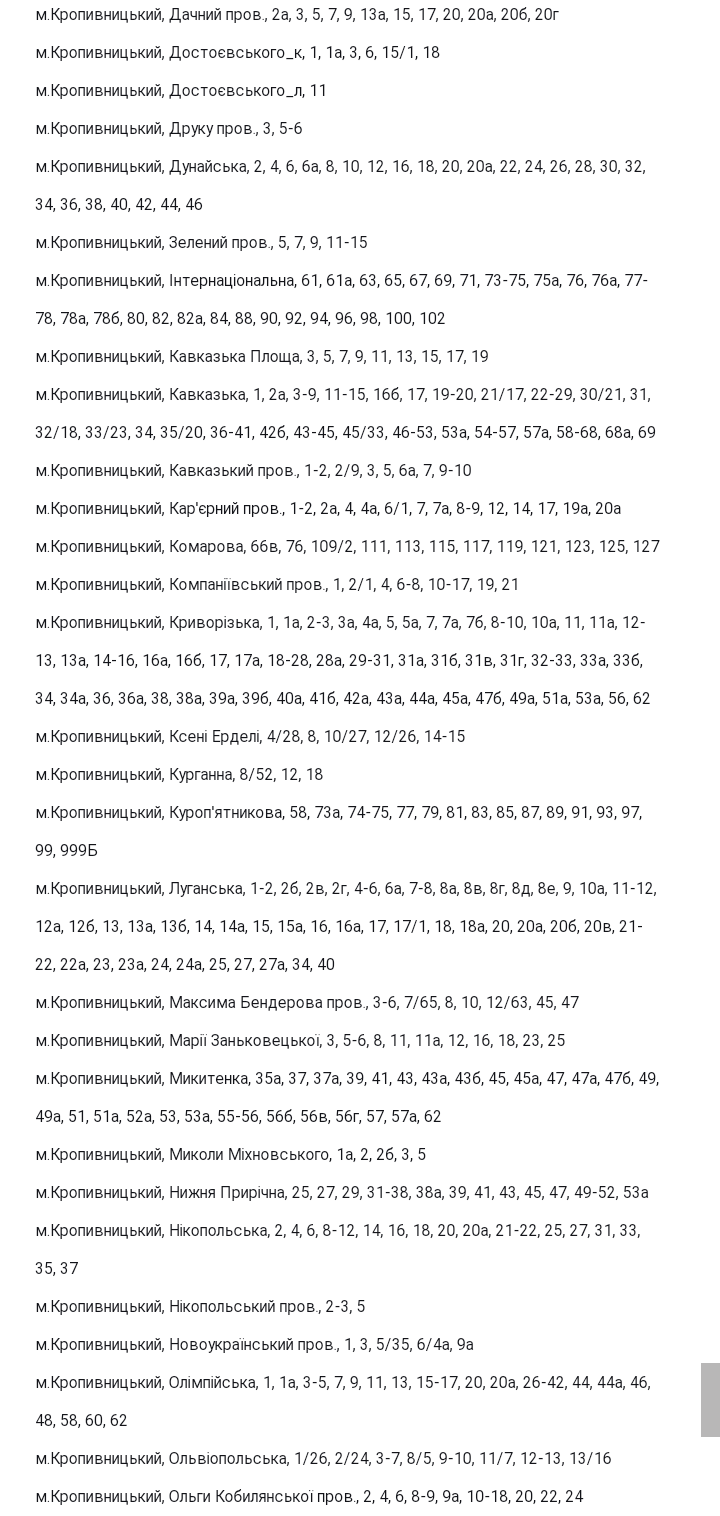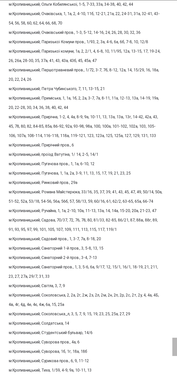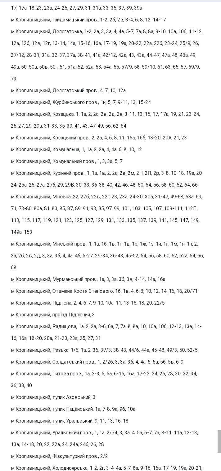 Відключення електроенергії проводитиметься з 09:00 до 17:00 за наступними адресами: