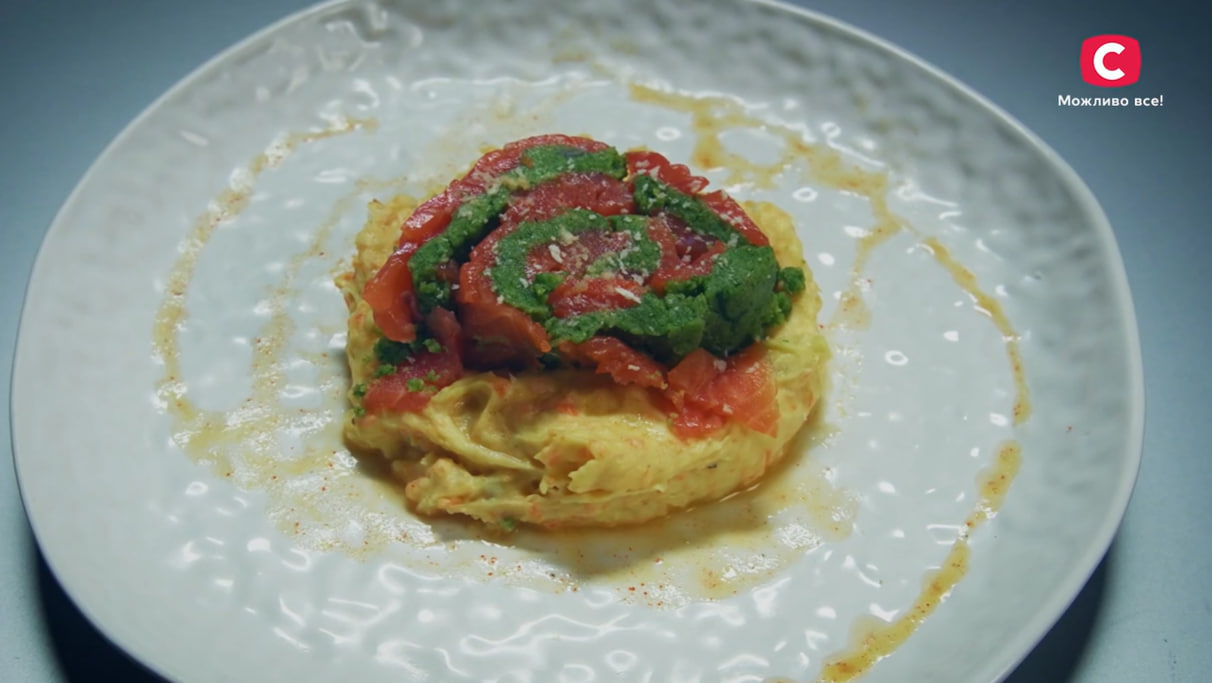 “Це рулет з маринованого в апельсині та чилі лосося, всередині начинка зі шпинату, вершкового масла, вершків та сухарів панко. А також пюре картопляне і соус на основі овочево-м’ясного бульйону”, -презентувада страву Ксенія.