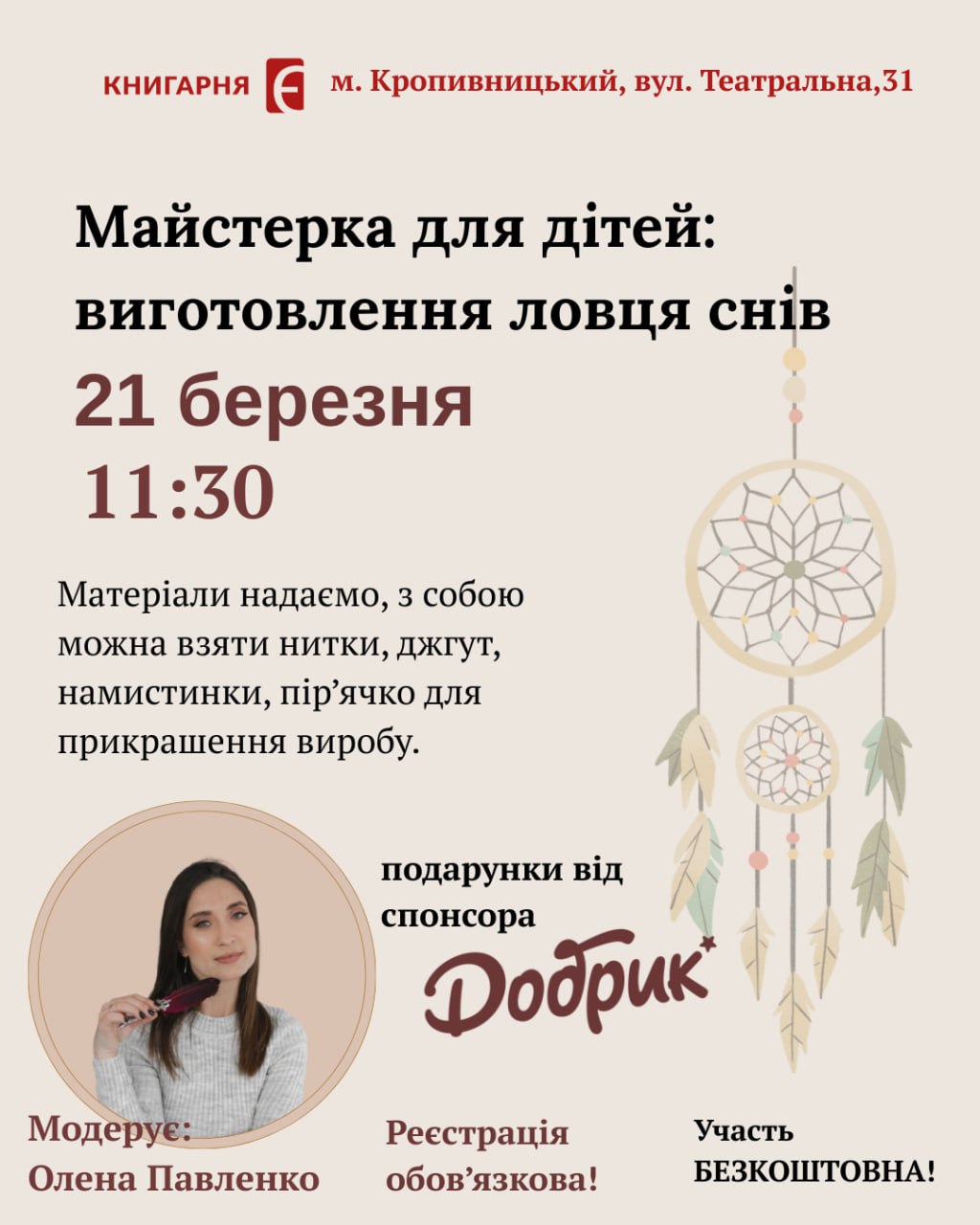 «Це чудова нагода для дiтей проявити фантазiю, попрацювати з рiзними матерiалами та створити власний оберiг для гарних снiв. Кожна дитина зможе прикрасити свiй вирiб нитками, намистинками та пiр’ячком i забрати його додому».