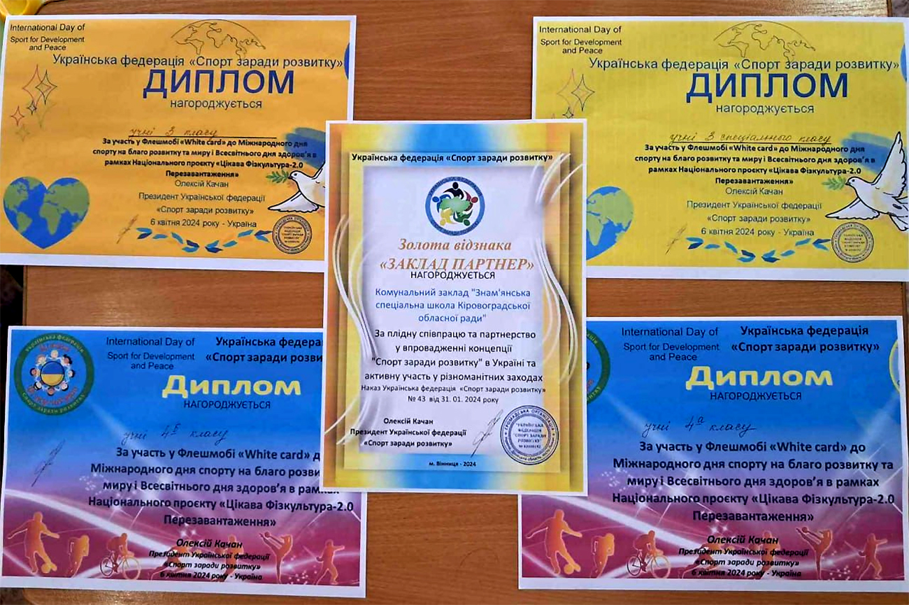 Окрiм диплому за участь у флешмобi “White card”, Знам’янська спецшкола також отримала вiдзнаку “Заклад-партнер” за спiвпрацю у впровадженнi концепцiї “Спорт заради розвитку” та активну участь у рiзноманiтних заходах у рамках Мiжнародного дня спорту на благо розвитку та миру i Нацiонального проекту “Цiкава фiзкультура – 2.0 Перезавантаження”.