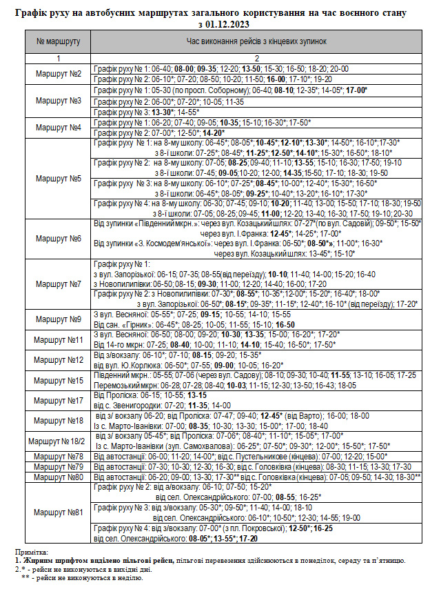Жирним шрифтом виділено пільгові рейси, пільгові перевезення здiйснюються в понедiлок, середу та п’ятницю, крім вихідних.