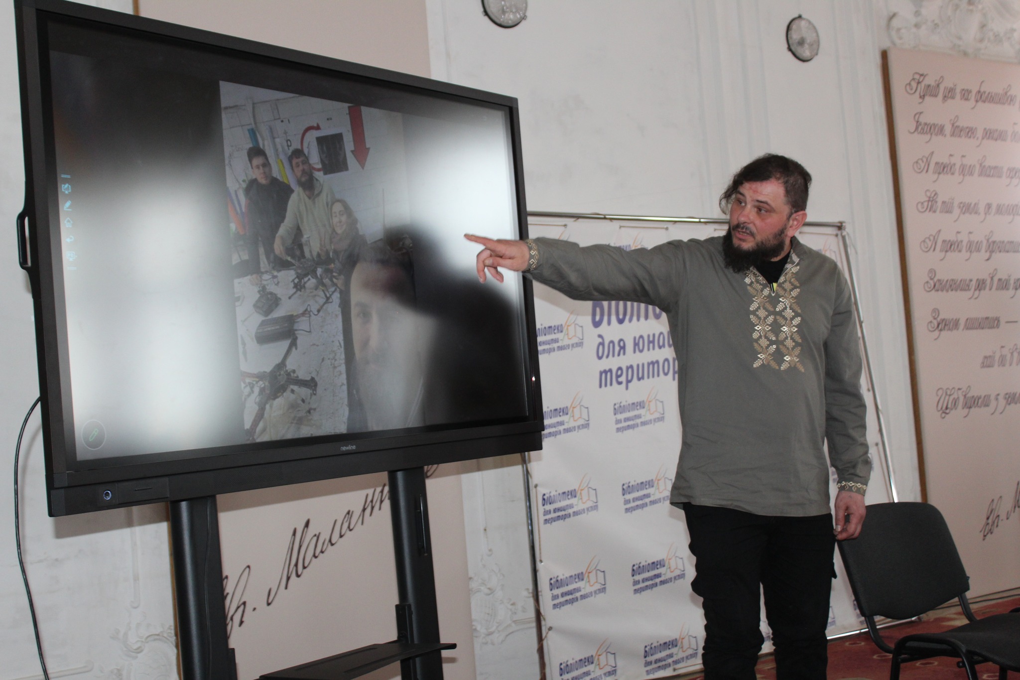 Також поет-військовослужбовець передав директорці обласної бібліотеки для юнацтва імені Євгена Маланюка Ларисі Савенко подарунки – власну книжку та книги львівських авторів.