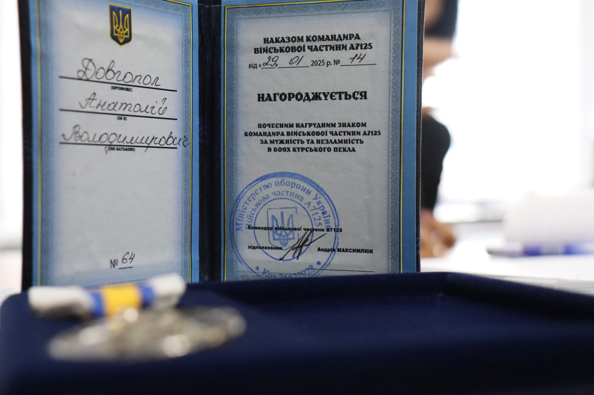 Почесний нагрудний знак командира вiйськової частини А 7125 за мужнiсть та незламнiсть в боях курського пекла безвiстi зниклого за особливих обставин Довгопола Анатолiя Володимировича. вручили доньцi Iринi Анатолiвнi.