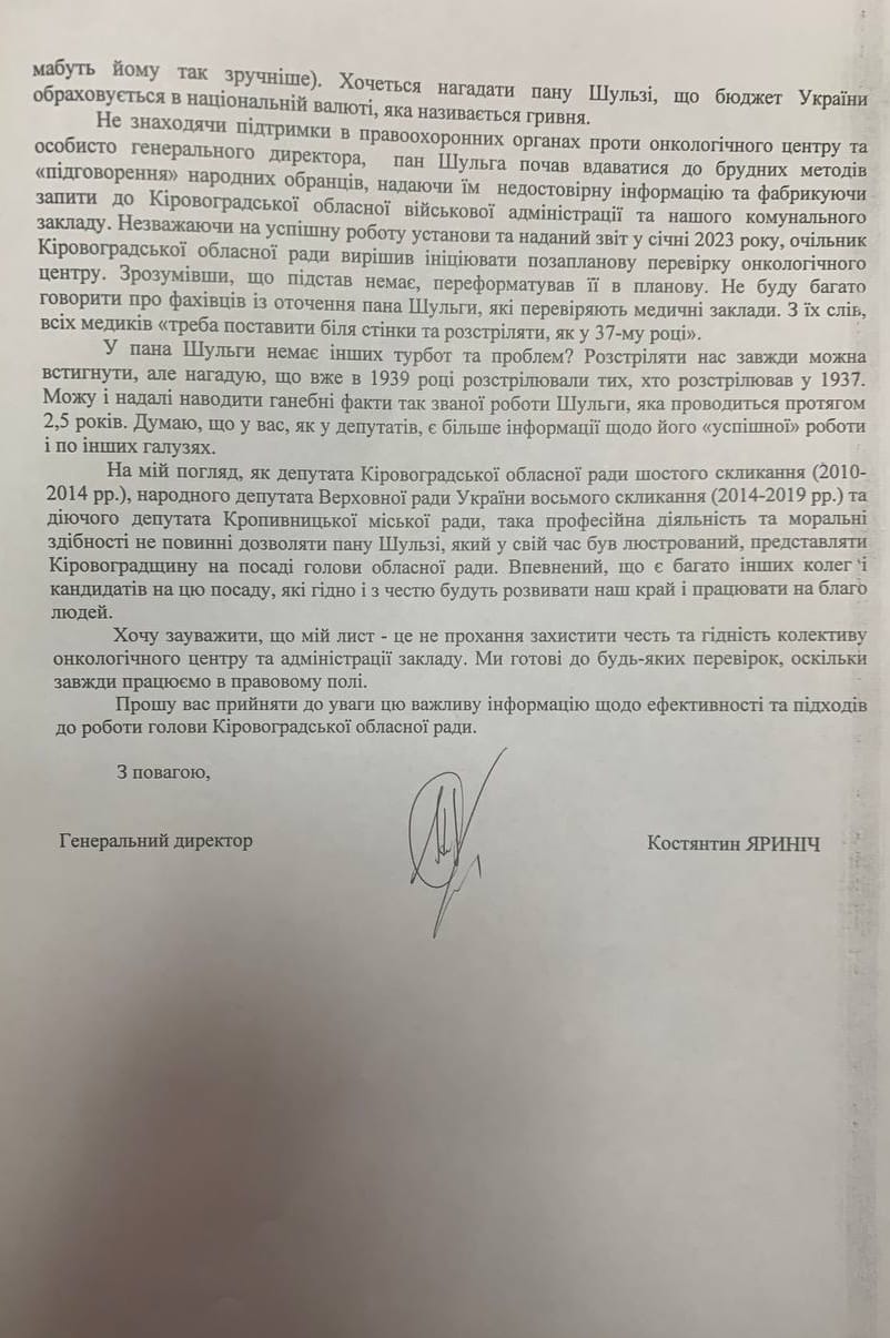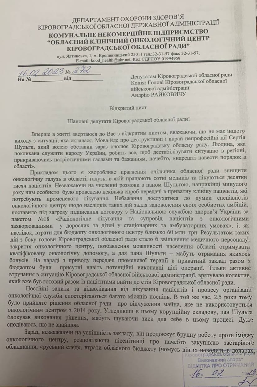 Враховуючи, усі дії спрямовані на знищення онкоцентру з боку Сергія Шульги, директор закладу направив до Кіровоградської обласної ради відкритий лист, щоб народні обранці звернули на цю ситуацію увагу та не дали знищити черговий комунальний заклад у нашій області.