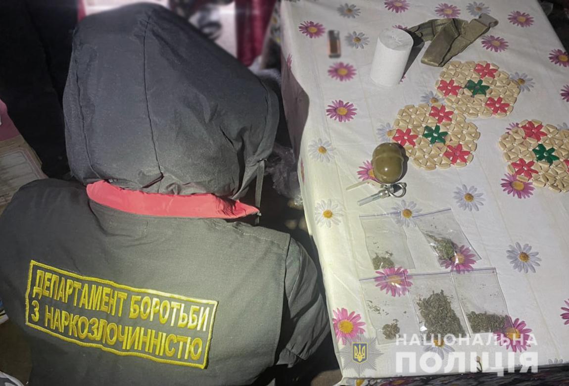 За силової пiдтримки роти полiцiї особливого призначення та пiд процесуальним керiвництвом обласної прокуратури, за мiсцями проживання осiб було проведено санкцiонованi обшуки. У результатi полiцейськi виявили та вилучили понад 80 доз наркотичного засобу i психотропної речовини: полiмернi трубки з амфетамiном та зiп-пакети з канабiсом. Крiм того, корпус гранати РГД-5 i запал до неї.