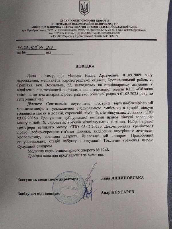 Житель села Трепівка Кропивницького району, Малюга Нікіта Артемович 01.09.2009року народження, наразі перебуває в обласній дитячій лікарні.