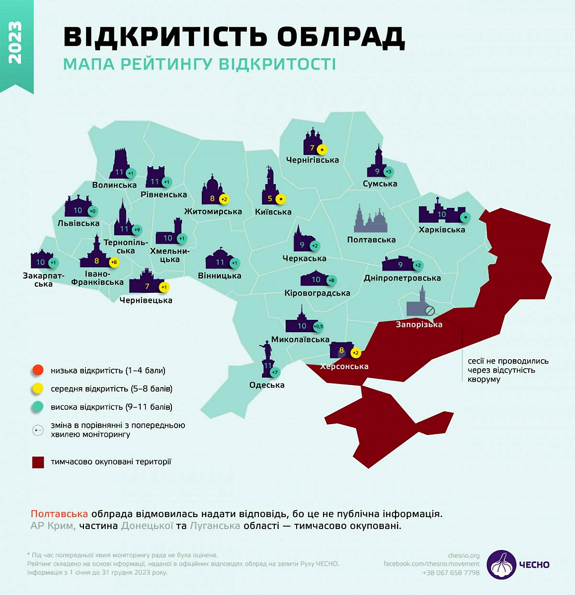 Найвищий бал вiдкритостi (11) отримали п’ять обласних рад України, iнформує Златопiль.