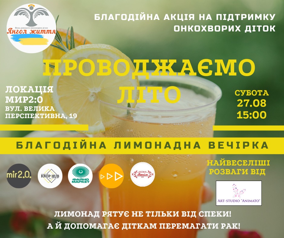 “Лимонад рятує не тільки від спеки! А й допомагає діткам! Приходимо! Радіємо! Освіжаємося! Проводжаємо це літо! Допомагаємо дітям перемогти рак! Якщо ви захочете підтримати наш захід смаколиками, ми з радістю їх приймемо”.
