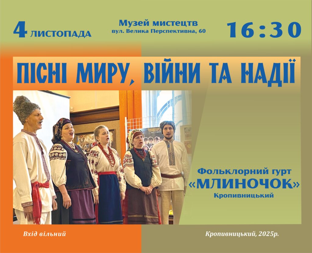 Шостий концерт – “Пісні миру, війни та надії”, відбудеться у Кропивницькому 4 листопада у Музеї мистецтв. Кропивничан і гостей міста запрошує на свій виступ автентичний гурт «Млиночок» та скрипалька Марія Полячок.
