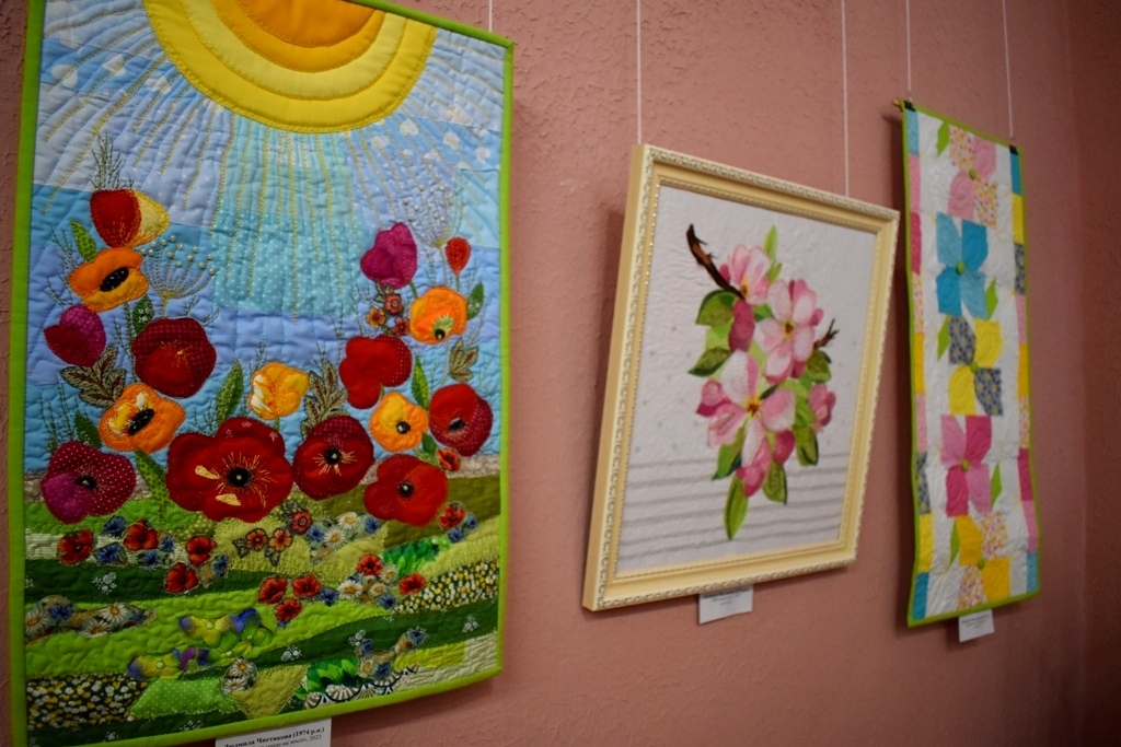 І окремий куточок займають роботи клаптикового живопису від місцевих майстринь печворку, а саме Людмили Кривенко та її учениці Людмили Чистякової. Взагалі, коли вперше бачиш картини Людмили Кривенко, то вони заворожують. Ти знаходишся за декілька кроків від картини, то бачиш роботу, написану фарбами і мазки здаються м’якими. Підходиш ближче, щоб придивитися, і бачиш, що об’ємні мазки пензлика – то крихітні шматочки тканини. Для майстрині дуже важливий елемент несподіванки, непередбачуваності, відкриття. А живописний ефект її художніх квілтів від оптичного з’єднання латочок різних тканин і, звичайно, від стьобання, що додає тривимірності зображення.