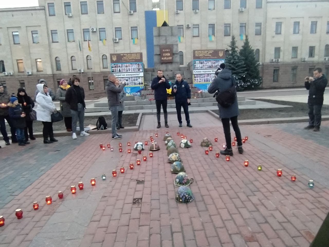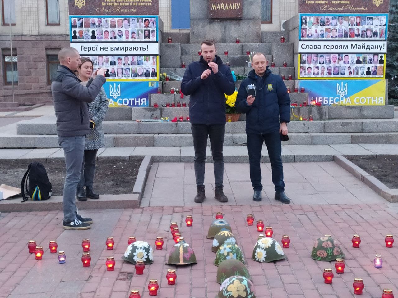 З лампадок присутнi утворили фiгурку янгола, а з розмальованих касок iнсталяцiю – в пам’ять про загиблих у Дебальцевому.