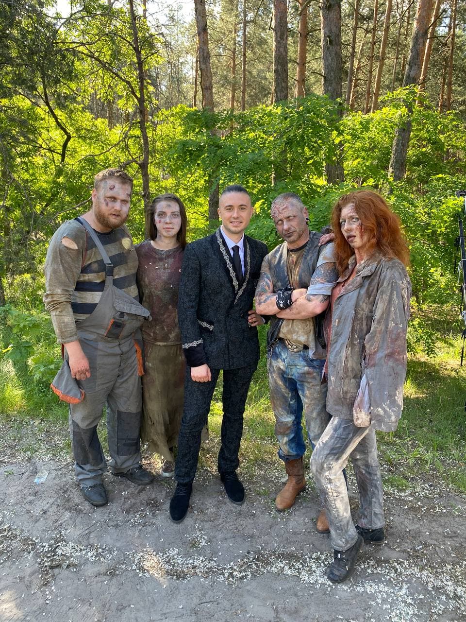 “Дуже тяжко було не похизуватися новим образом. Але ось кліп вже в Ютубі, думаю він взірве людям голови від крутого поєднання відеоряду і музичної теми… На другому фото наша команда з Кропивницького, яка також брала участь у зйомках”, – пише фотограф.