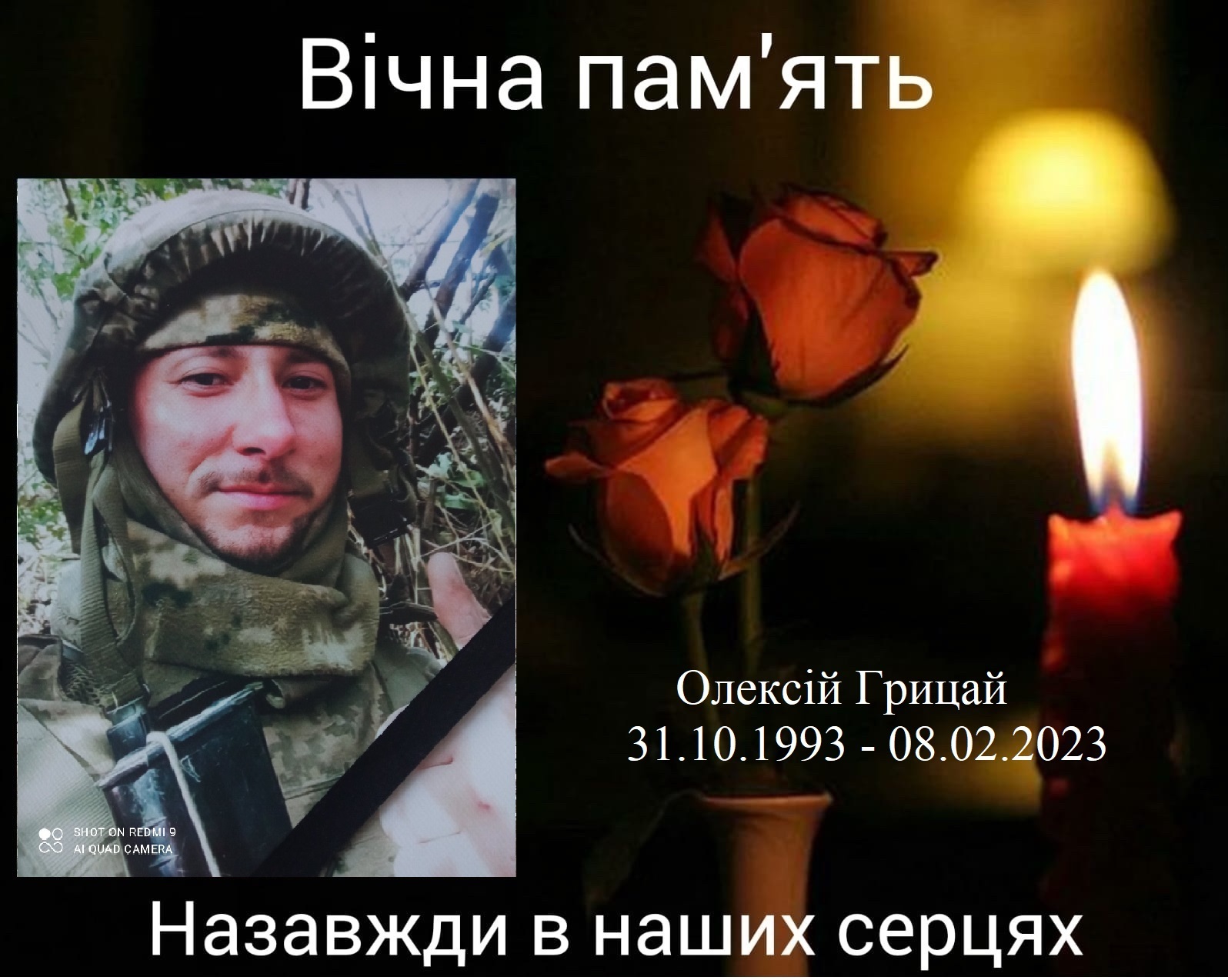 Старший солдат, 29- річний Олексій Грицай загинув 08 лютого 2023 року, тримаючи оборону Вугледара Волновахського району Донецької області. Довгий час захисники вважалися зниклими безвісти.