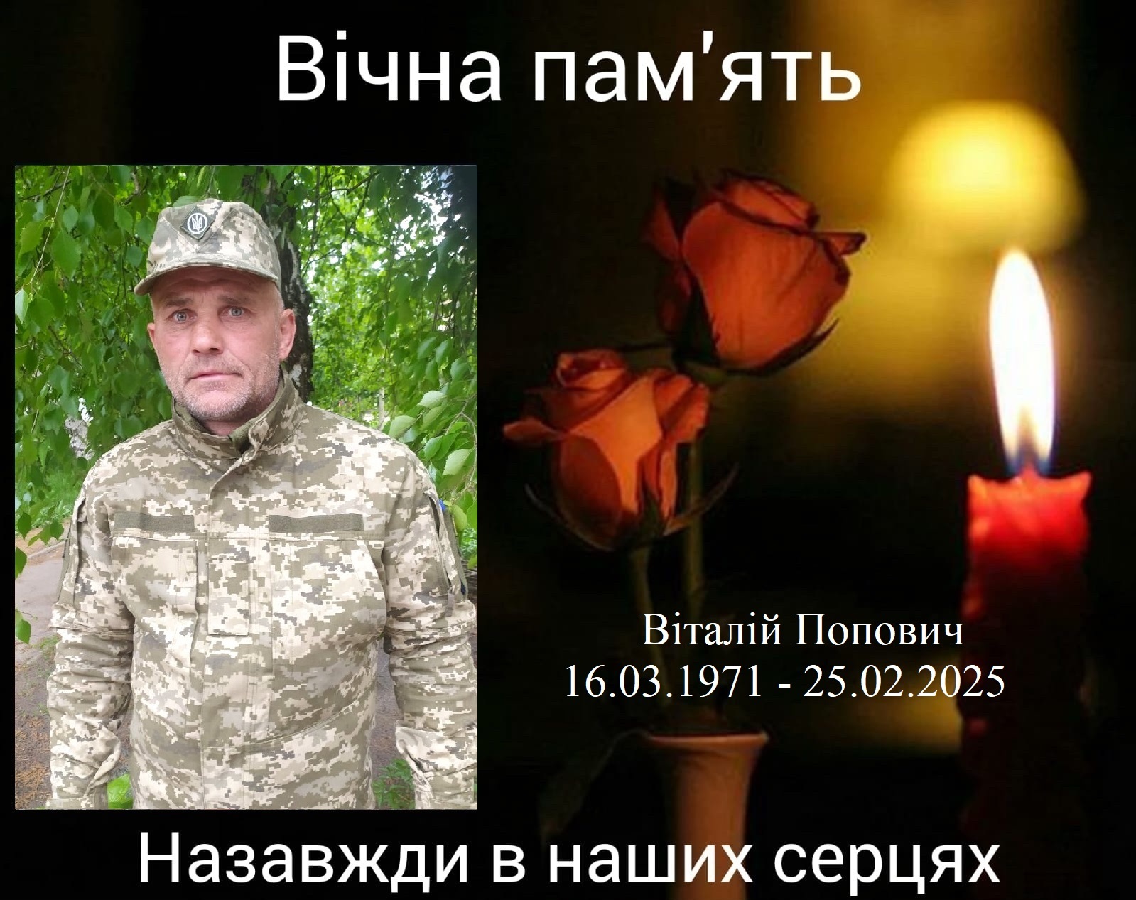 Солдат Віталій Попович, 1971 року народження, навідник аеромобільного відділення, загинув 25 лютого 2025 року поблизу населеного пункту Погребки, Суджанського району, Курської області.