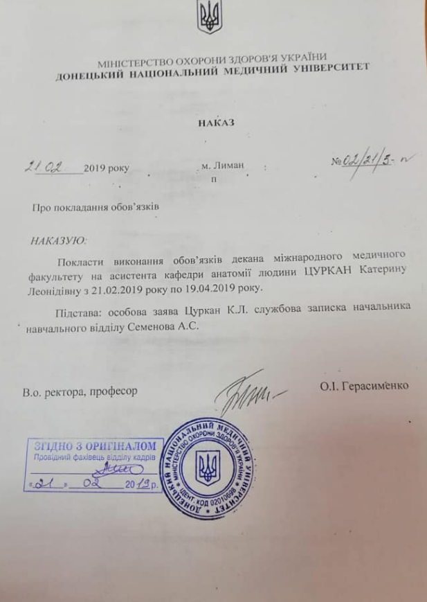 Наказом в.о. ректора ДНМУ від 21 лютого виконуючою обов’язки декана ММФ призначено аcиcтента кафедри анатомії людини Катерину Цуркан.