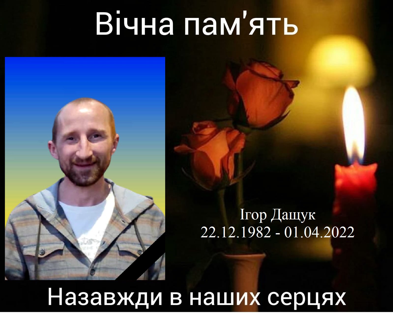 Солдат Ігор Дащук, 1982 року народження, стрілець-снайпер прийняв свій останній бій 01 квітня 2022 року, зупиняючи російських агресорів біля населеного пункту Велика Новосілка, Донецької області.