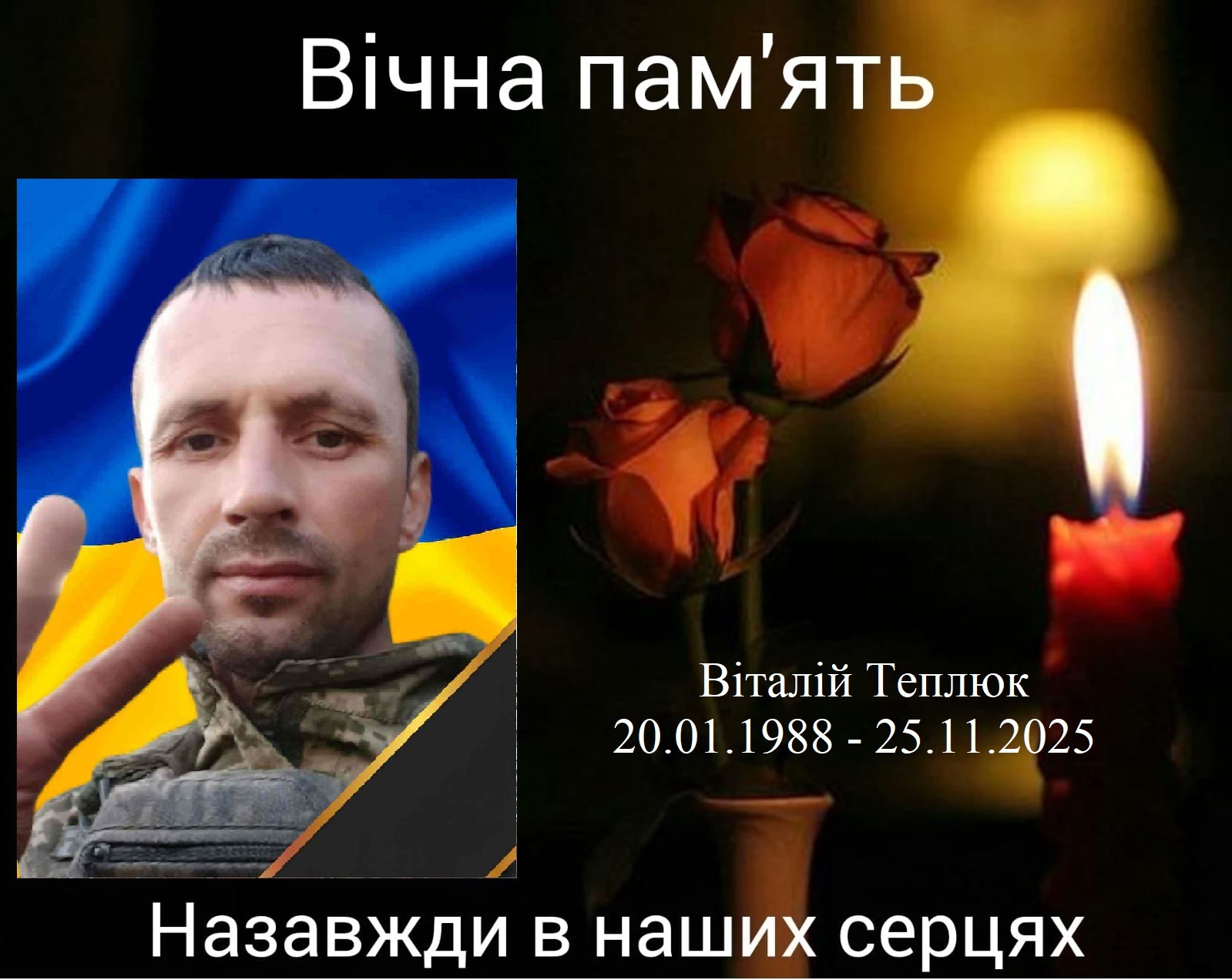 Солдат Віталій Теплюк, 1988 року народження, кулеметник помер у шпиталі 25 листопада 2025 року, мужньо тримав позиції біля населеного пункту Вовчанськ, Харківської області.