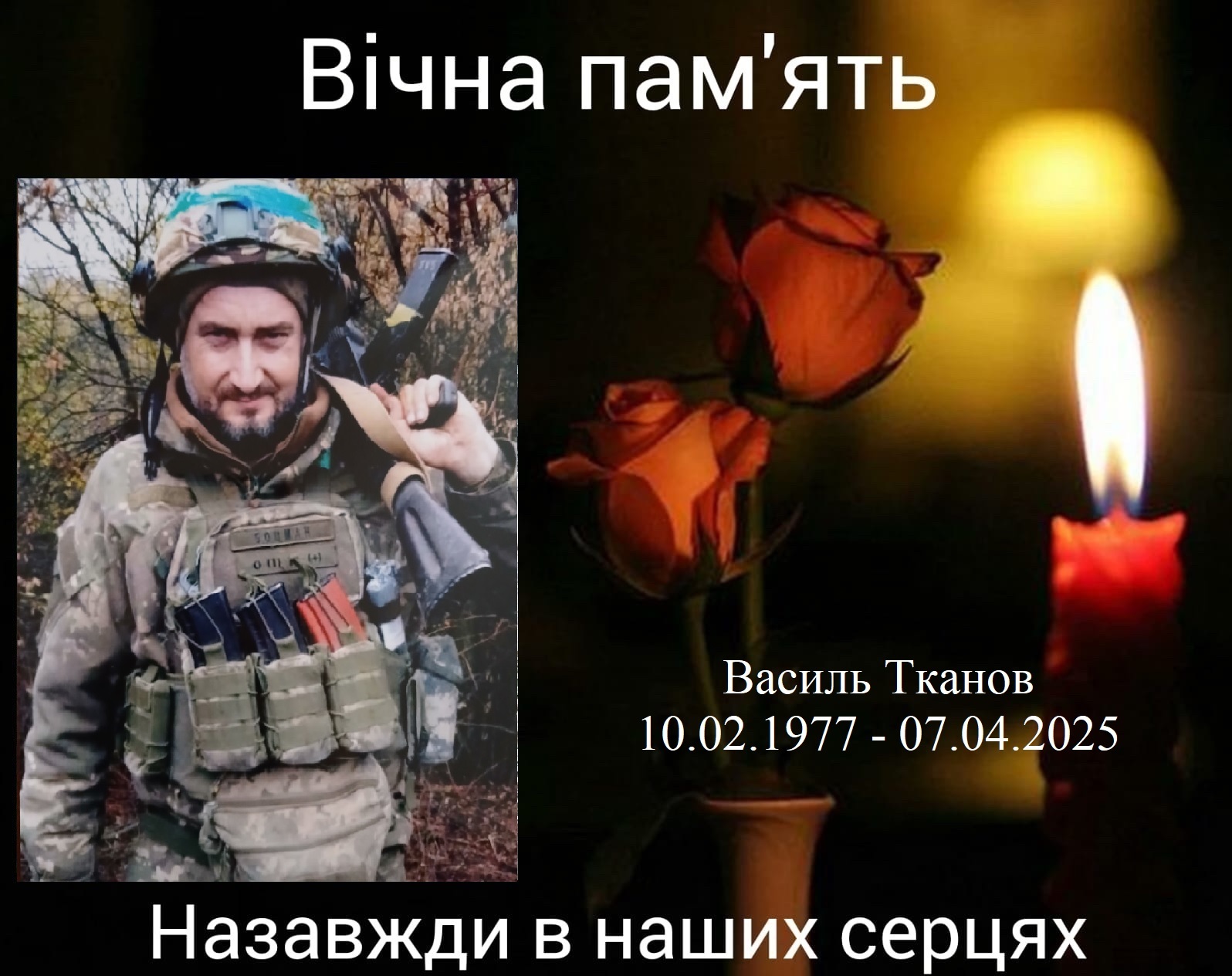 Старший солдат Василь Тканов, 1977 року народження, старший навідник протитанкового взводу загинув смертю хоробрих 07 квітня 2025 року, зупиняючи російських агресорів біля населеного пункту Івано-Дар’ївка Бахмутського району Донецької області.