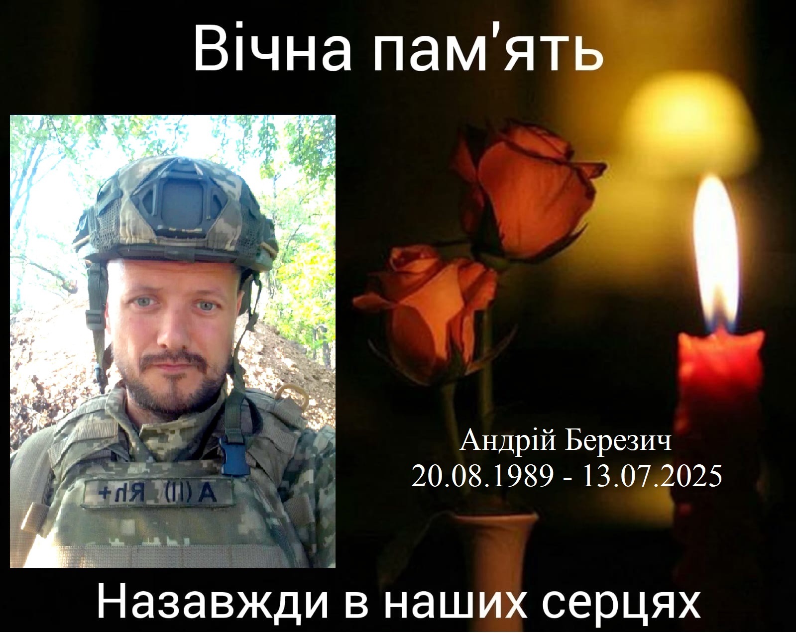 Солдат Андрій Березич, 1989 року народження, прийняв свій останній бій 13 липня 2025 року, зупиняючи російських агресорів біля населеного пункту Ступочки Краматорського району Донецької області.