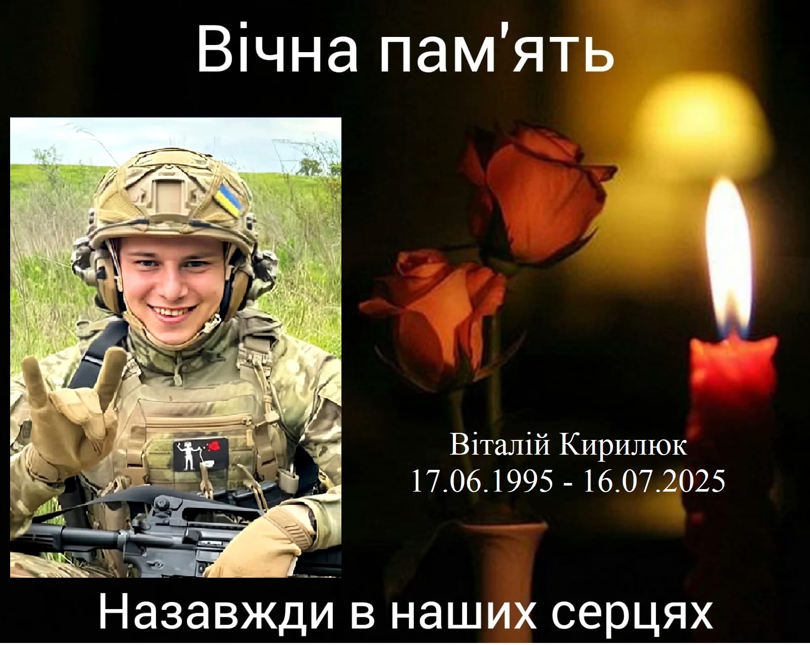 Матрос Віталій Кирилюк, 1995 року народження, загинув під час виконання бойової операції 16 липня 2025 року біля населеного пункту Райське Краматорського району Донецької області.