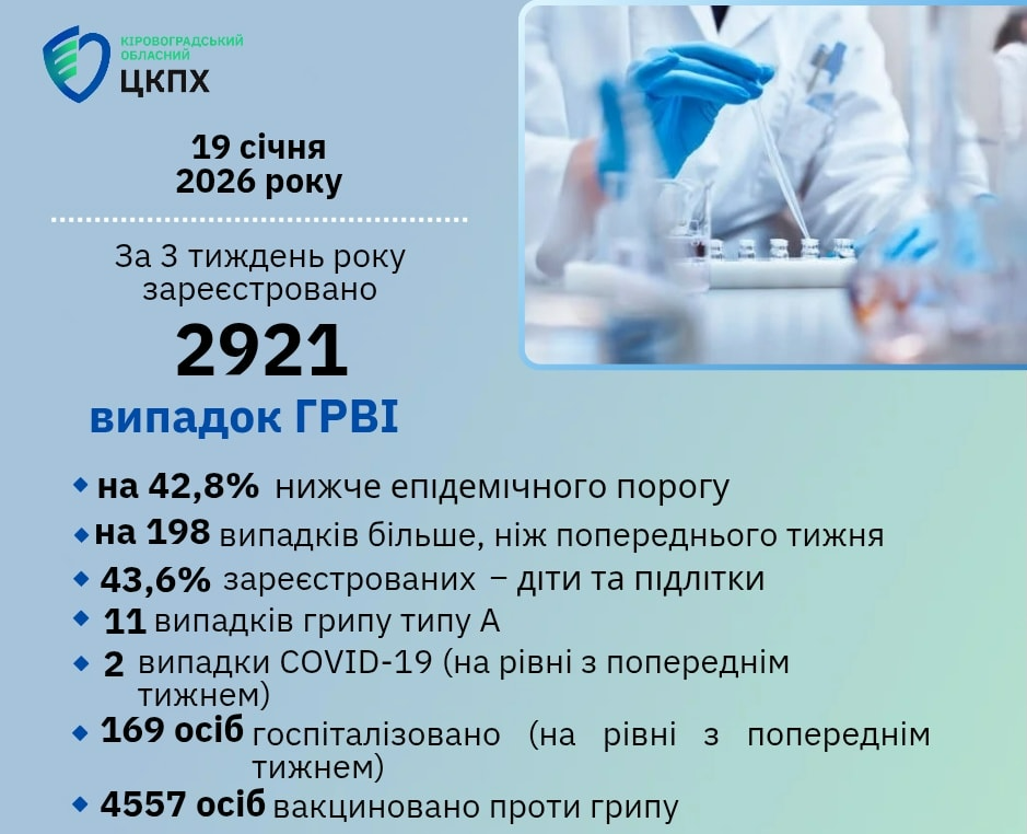 Протягом тижня лабораторно пiдтверджено 2 випадки COVID-19. Також зафiксовано 11 випадкiв грипу типу А.