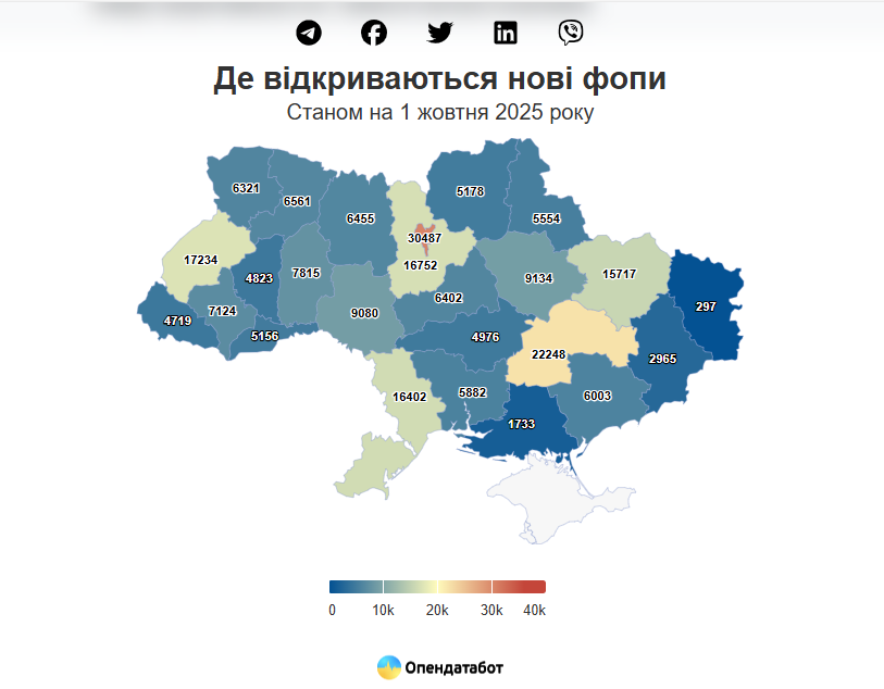 225 046 нових фопів зареєстровано цьогоріч в Україні. Водночас 213 293 підприємці закрились, що на 11% більше, ніж у 2024 році.