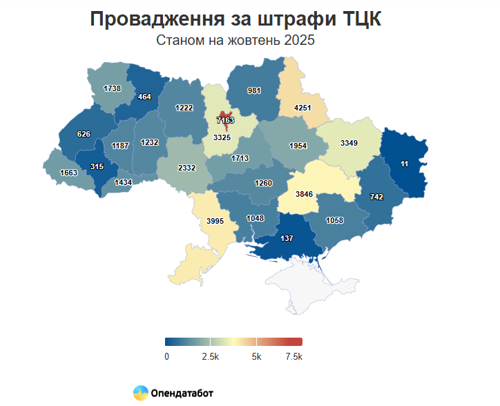Найспокійніше — на заході та в зоні бойових дій: Львівщина — 626, Рівненщина — 464, Івано-Франківщина — 315, Херсонщина — 137, Луганщина — всього 11.