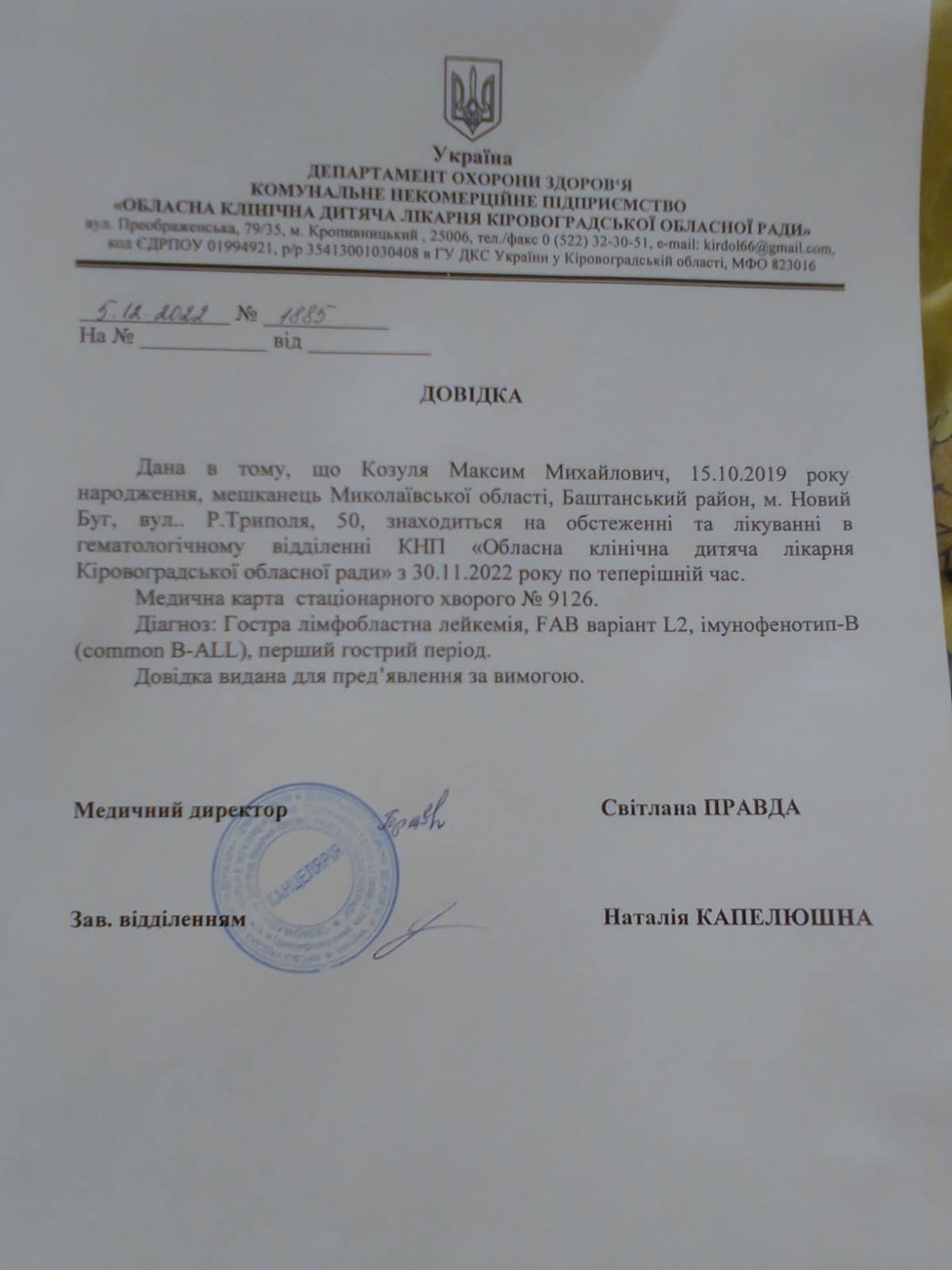 Малюку діагностували гостру лімфобластну лейкемію (рак крові першої стадії).