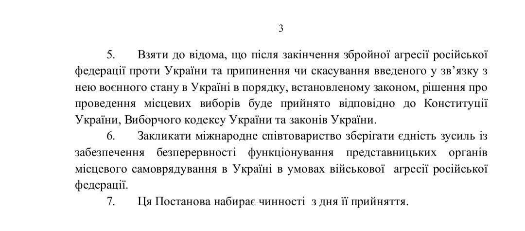 Згідно із законодавством, у жовтні цього року мали б відбутися чергові місцеві вибори. Однак через воєнний стан їх проведення є неможливим. Постанова передбачає, що чинні органи місцевого самоврядування зберігають свої повноваження до моменту, коли стане можливим проведення виборів та обрання нових представників громад.