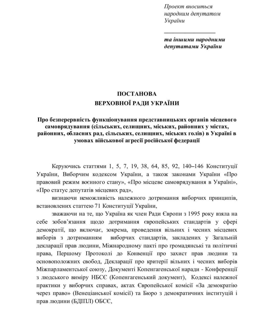 У Верховній Раді України зареєстровано постанову, яка забезпечує безперервність функціонування представницьких органів місцевого самоврядування.