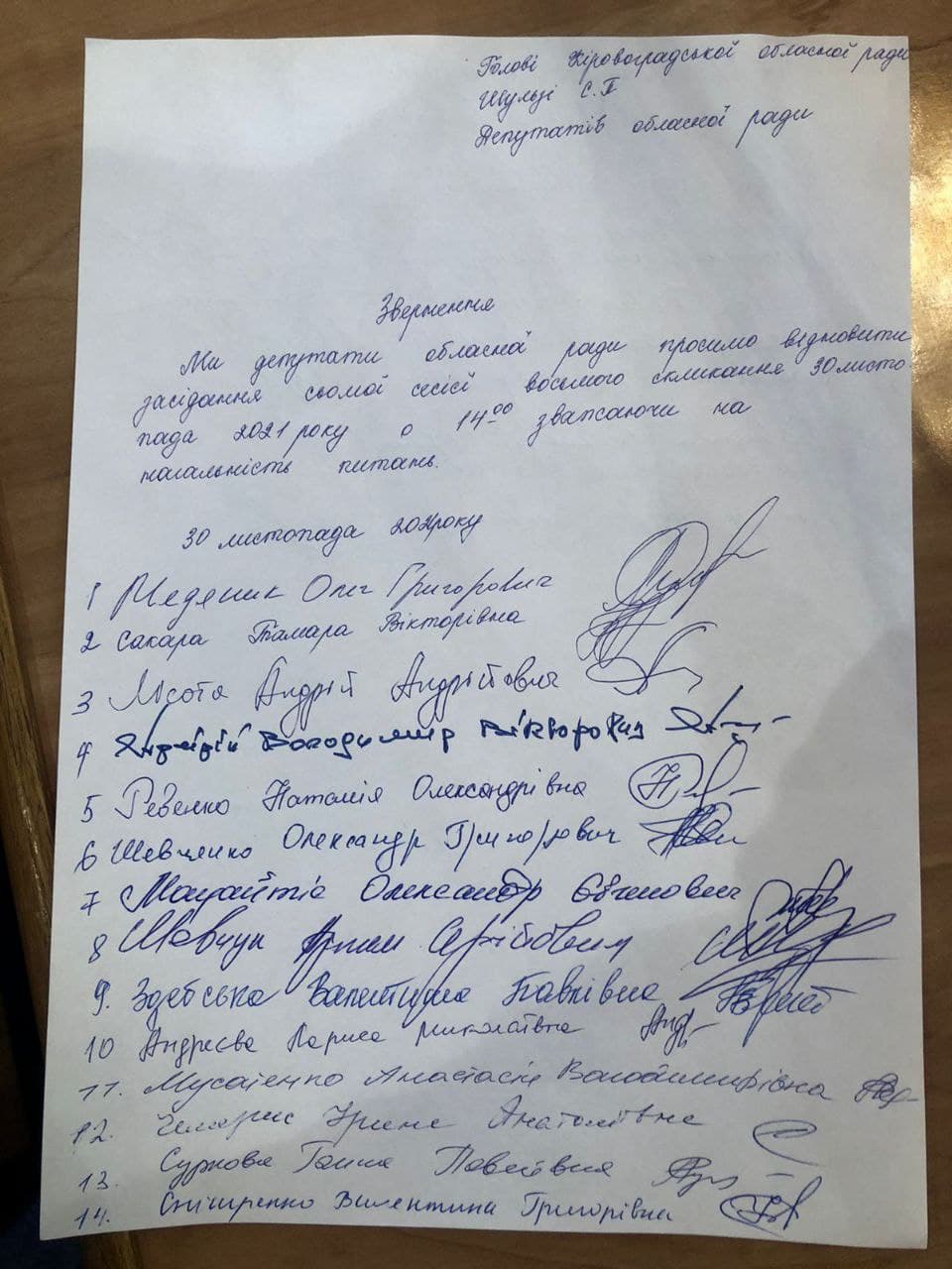 Після оголошення перерви, 27 депутатів від фракцій ВО ”Батьківщина”, ”Європейської солідарності” та ” За майбутнє” підготували звернення до голови облради, стосовно зібрання позачергової сесії та вручили його.