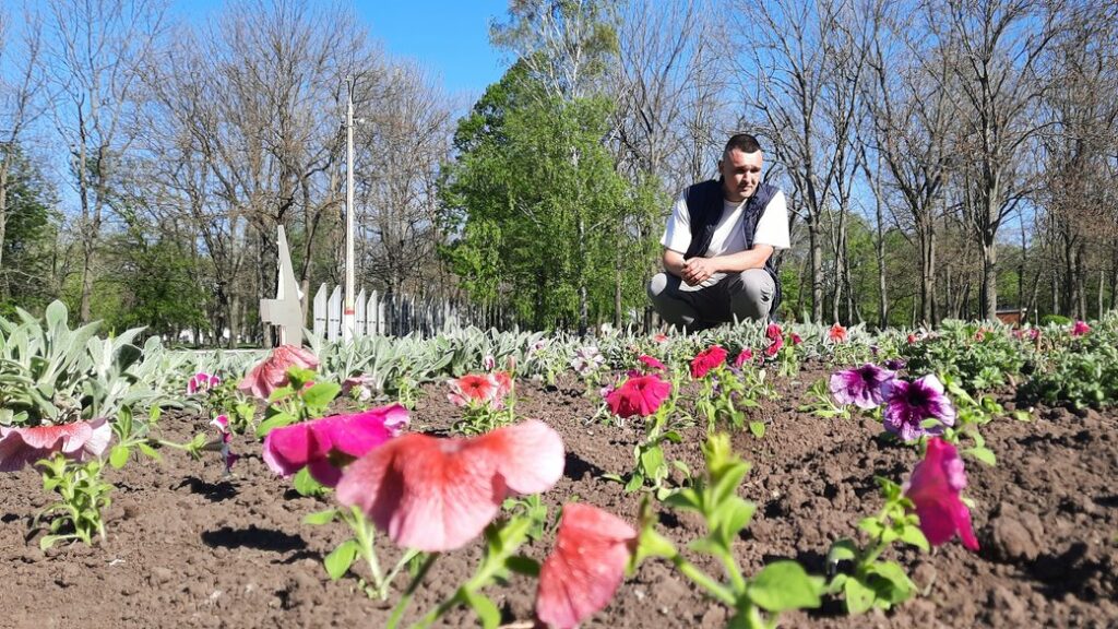 Квiти висадив на центральнiй клумбi меморiального комплексу. Це – 300 петунiй рiзних кольорiв. За два-три тижнi вони розростуться i заповнять всю клумбу. Квiти Iгор Щербановський виростив в оранжереї, яку облаштувала вдома його мама.