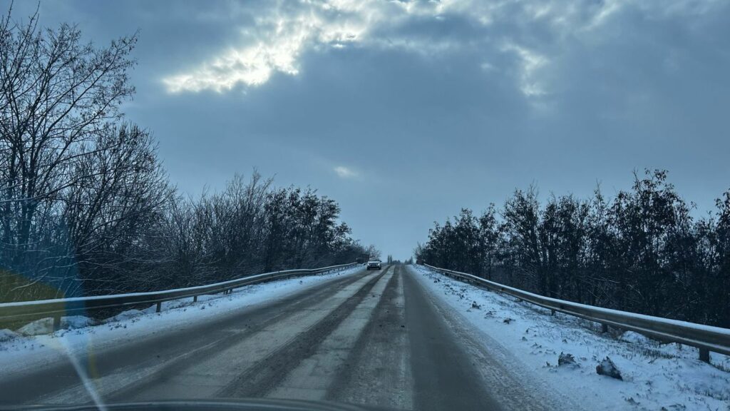 Подекуди покриття ще засніжене, бо продовжує сніжити, подекуди покриття мокре.