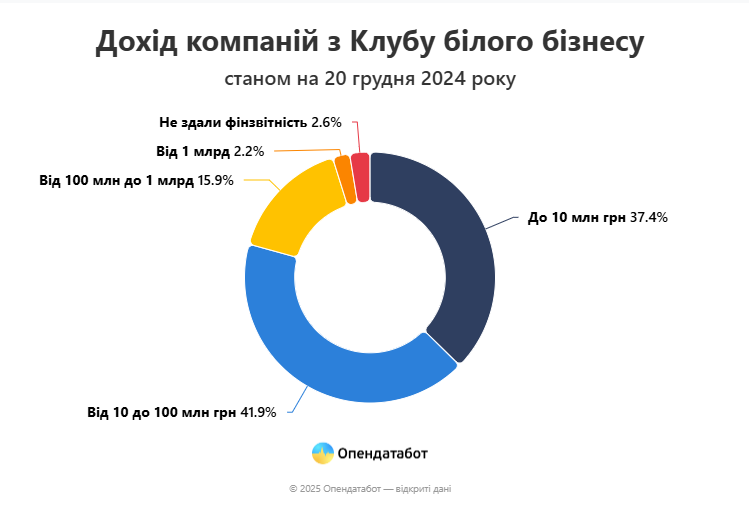 42% компанiй з Клубу бiлого бiзнесу заробляють вiд 10 до 100 мiльйонiв гривень на рiк — це 3,3 тисячi бiзнесiв. Ще 177 компанiй можуть похвалитися доходом понад 1 мiльярд гривень (2,2%). Ще 208 учасникiв Клубу не подали звiтнiсть до Держстату за 2023 рiк, вiдповiдно, оцiнити їх фiнансовi показники наразi неможливо.