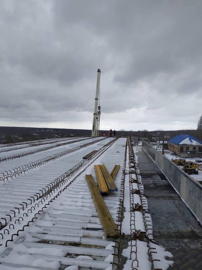 Мостобудiвельники влаштовують опалубку пiд монолiтну плиту та продовжують монтаж балок. Паралельно триває заготiвля матерiалiв для влаштування насипу.