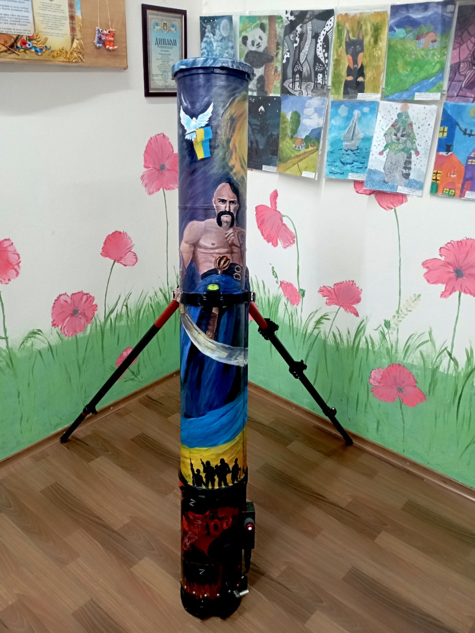 Розписаний тубус мiстить кiлька знакових символiв: козак, сонце, янгол, голуб миру, а також знищена технiка росiйських окупантiв. На його художнє оформлення знадобилося понад добу роботи.