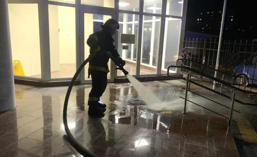 О 19:22 стало вiдомо про те, що на вул. Вокзальнiй обласного центру виникла пожежа пластикового покриття ганку адмiнiстративного примiщення.