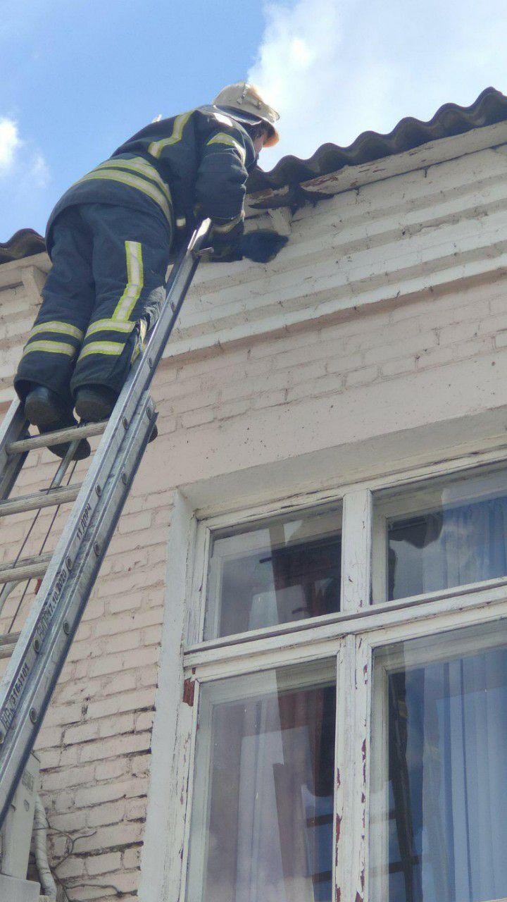 Рятувальники 2-го Державного пожежно-рятувального загону по триколiннiй драбинi вибралися на дах будинку, визволили птаха та передали небайдужим громадянам, якi першими помiтили нещастя i викликали рятувальний пiдроздiл.