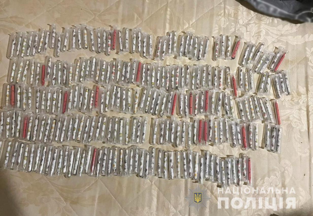 Всього з незаконного обігу вилучено значну кількість зіп-пакетів змотаних клейкою стрічкою та пластикових колб із підготовленими до продажу психотропними речовинами та прекурсорами.