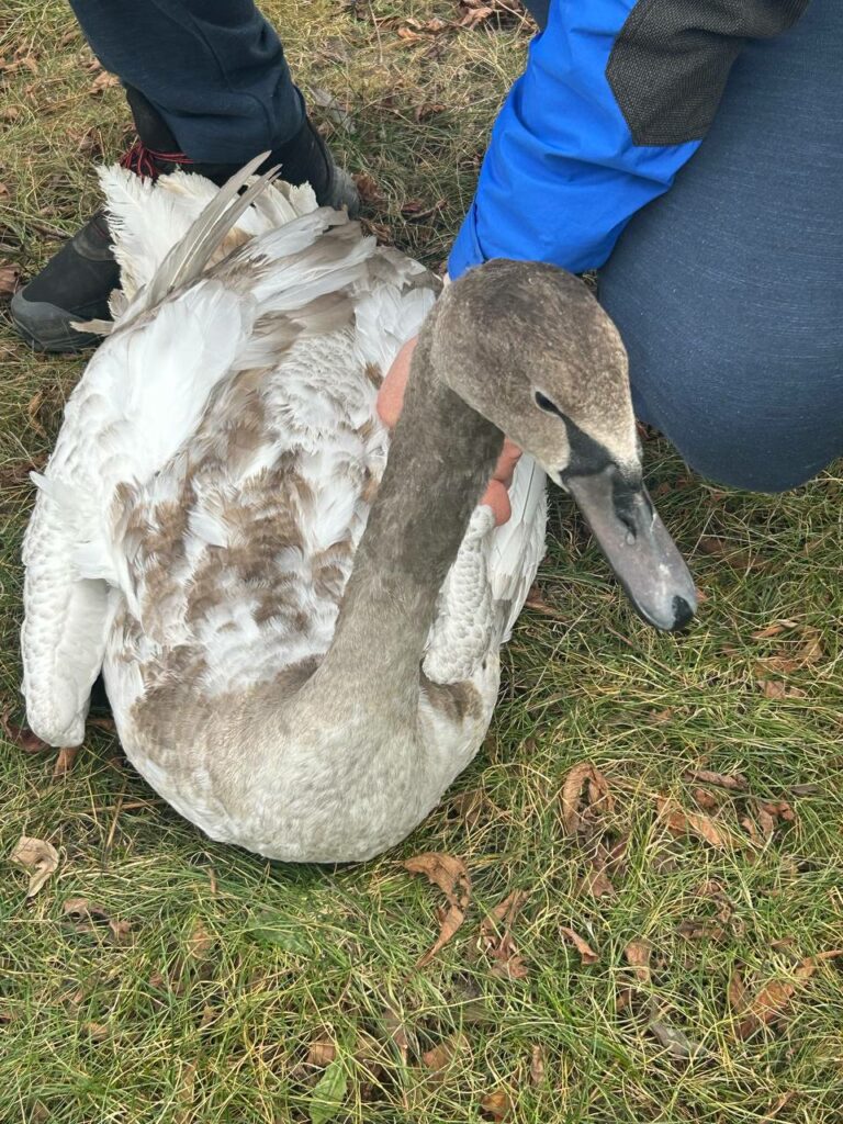 Завдяки небайдужим мешканцям Первозванiвки, його лебедя врятували i перевезли в безпечне мiсце для його одужання .  Навеснi планується вiдпустити птаха в природне середовище – на водне плесо.